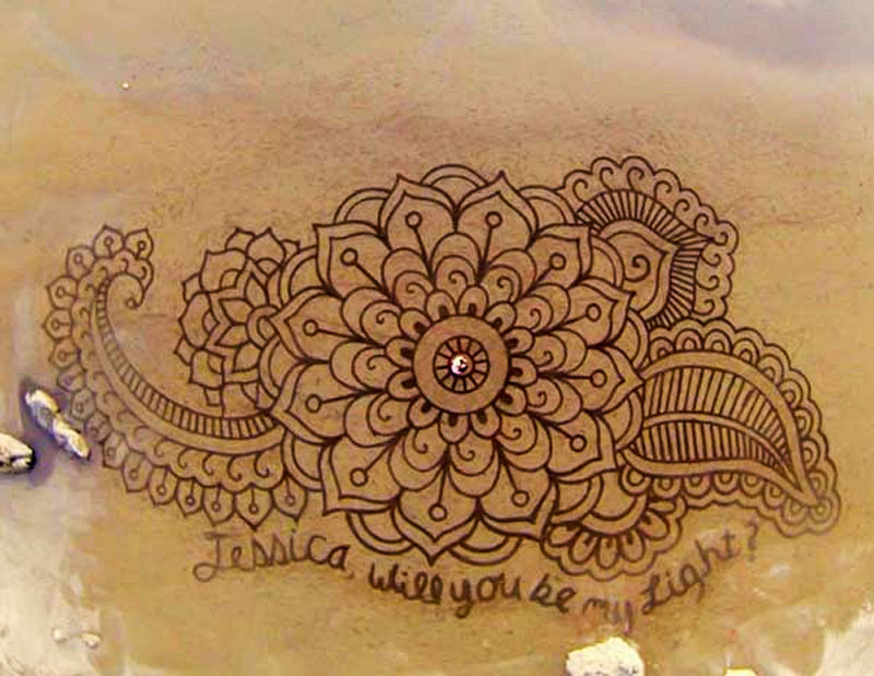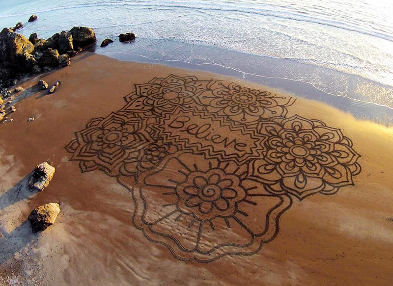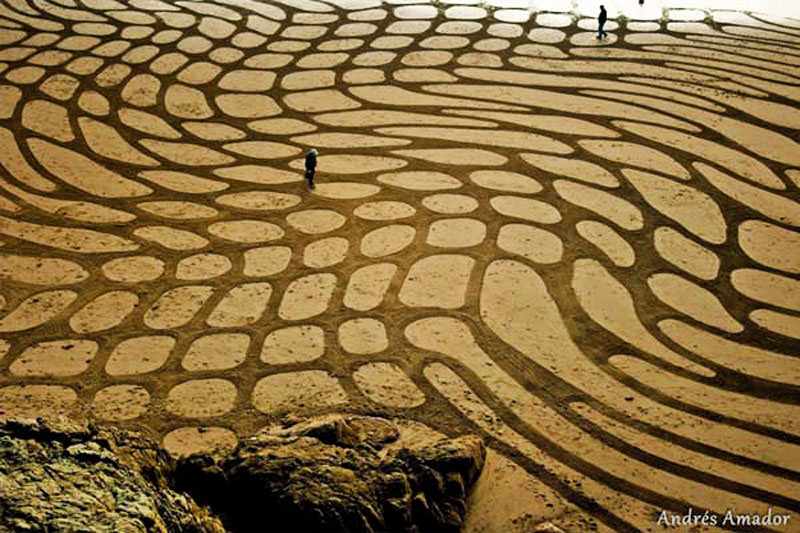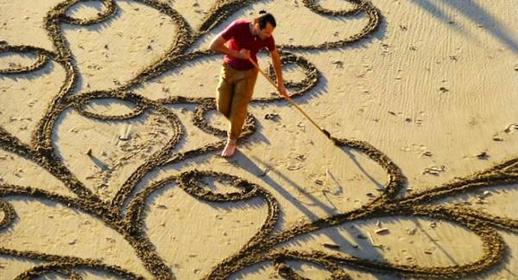 Φορώντας τα ρούχα του πιάνει μία τσουγκράνα και παίζει με την άμμο... δημιουργώντας εκπληκτικά έργα τέχνης.